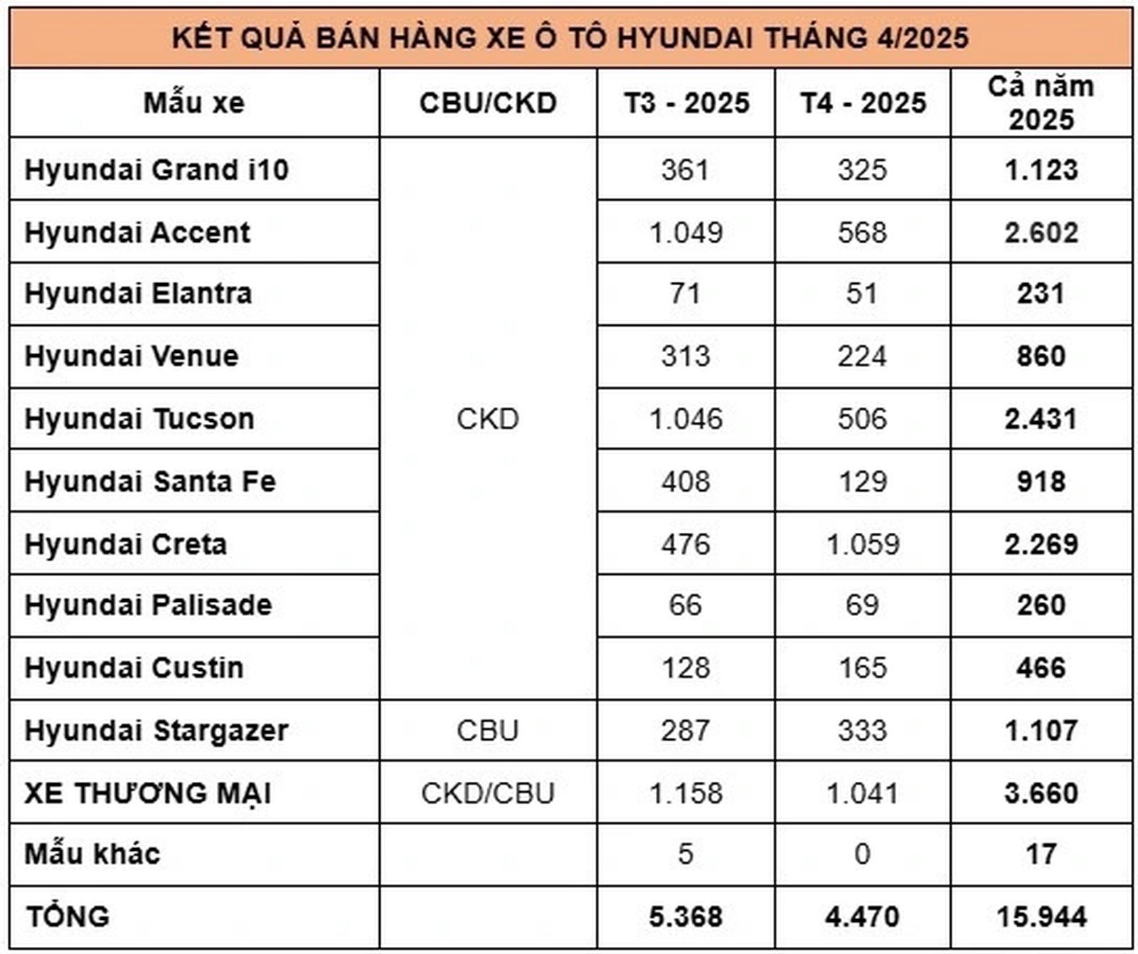 Tập đoàn Thành Công (TC Group) công bố kết quả bán hàng tháng 4/2025, với tổng doanh số xe Hyundai đạt 4.470 xe trên toàn thị trường.