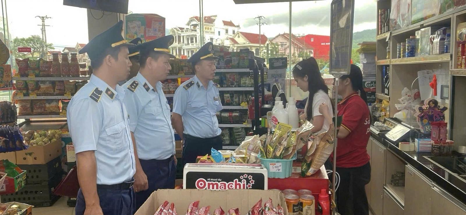 Đoàn kiểm tra liên ngành kiểm soát hàng hóa, nhãn mác và nguồn gốc xuất xứ tại cửa hàng tạp hóa. Ảnh: NT