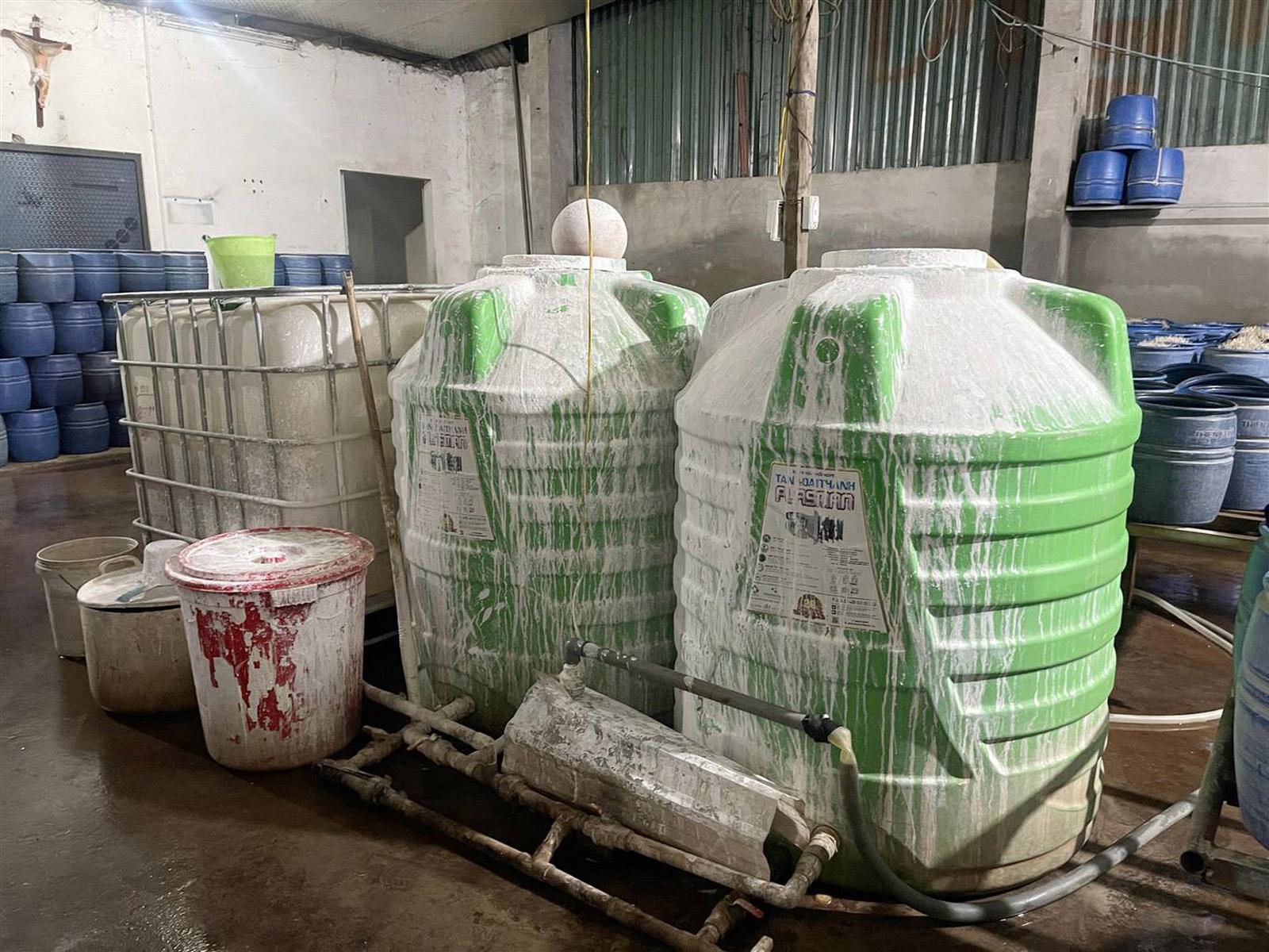 Cơ quan chức năng cũng thu giữ một số dung dịch đã pha chế để phục vụ việc sản xuất giá đỗ cùng các tang vật khác.