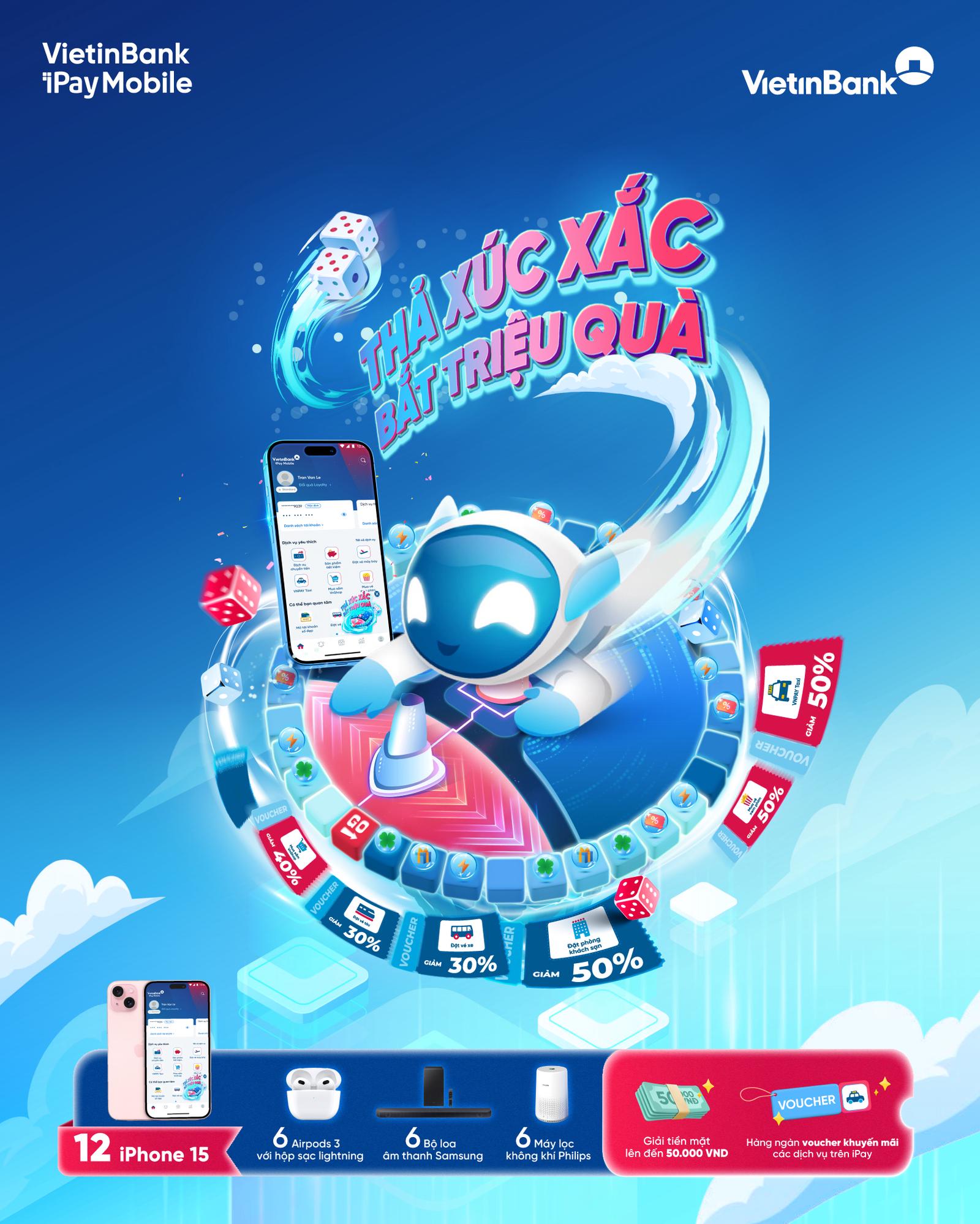 Cơ hội trúng iPhone 15, AirPods 3, bộ loa Samsung… miễn phí cùng hàng ngàn phần thưởng có giá trị trên VietinBank iPay Mobile.