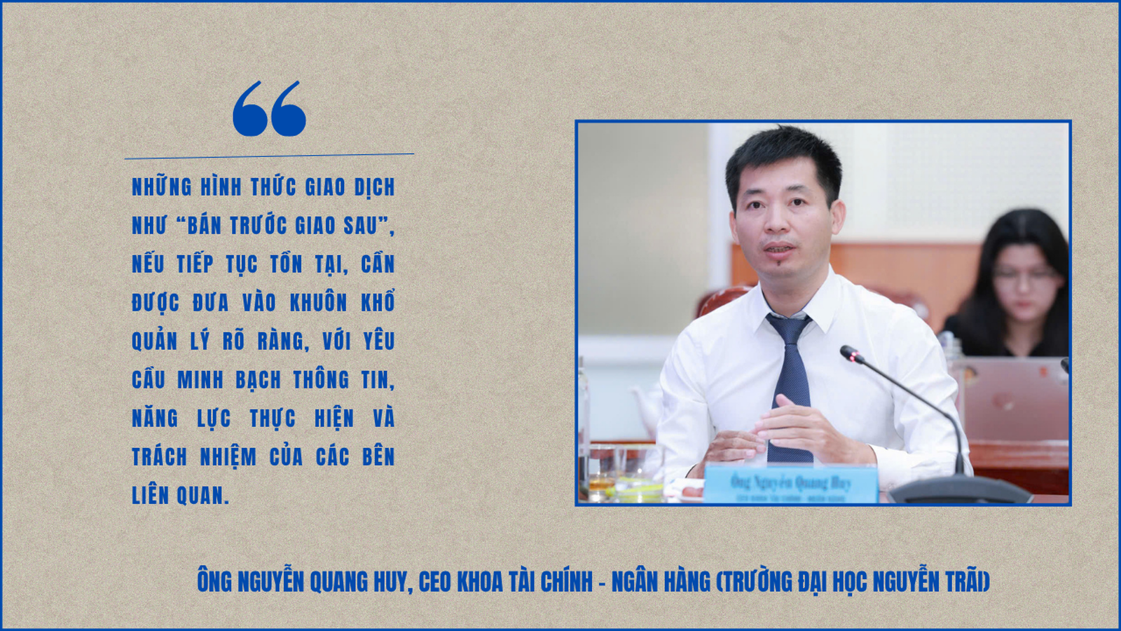 Một nội dung khác không kém phần quan trọng là hoàn thiện các chuẩn mực thị trường. Những hình thức giao dịch như "bán trước giao sau", nếu tiếp tục tồn tại, cần được đưa vào khuôn khổ quản lý rõ ràng, với yêu cầu minh bạch thông tin, năng lực thực hiện và trách nhiệm của các bên liên quan.