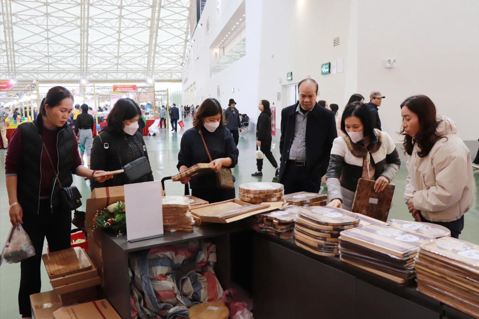 Người dân lựa chọn thực phẩm, quà biếu và đặc sản vùng miền phục vụ nhu cầu sắm Tết tại hội chợ. Ảnh: Phương Lan