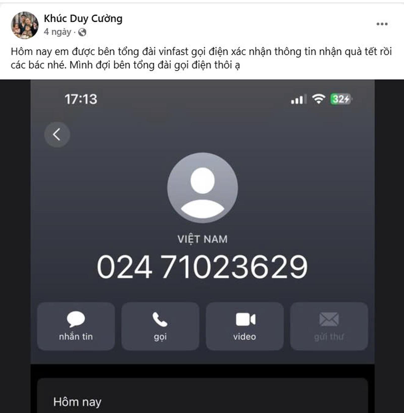 “Hôm qua có bạn gái giọng ‘ngọt lịm’ gọi xác nhận địa chỉ để VinFast gửi quà Tết. Mọi người có ai nhận được cuộc gọi không?” là bài đăng của tài khoản Tú Nguyễn trong cộng đồng VinFast VF 3 Ba Miền, một nhóm người dùng xe điện lớn với 71.000 thành viên.