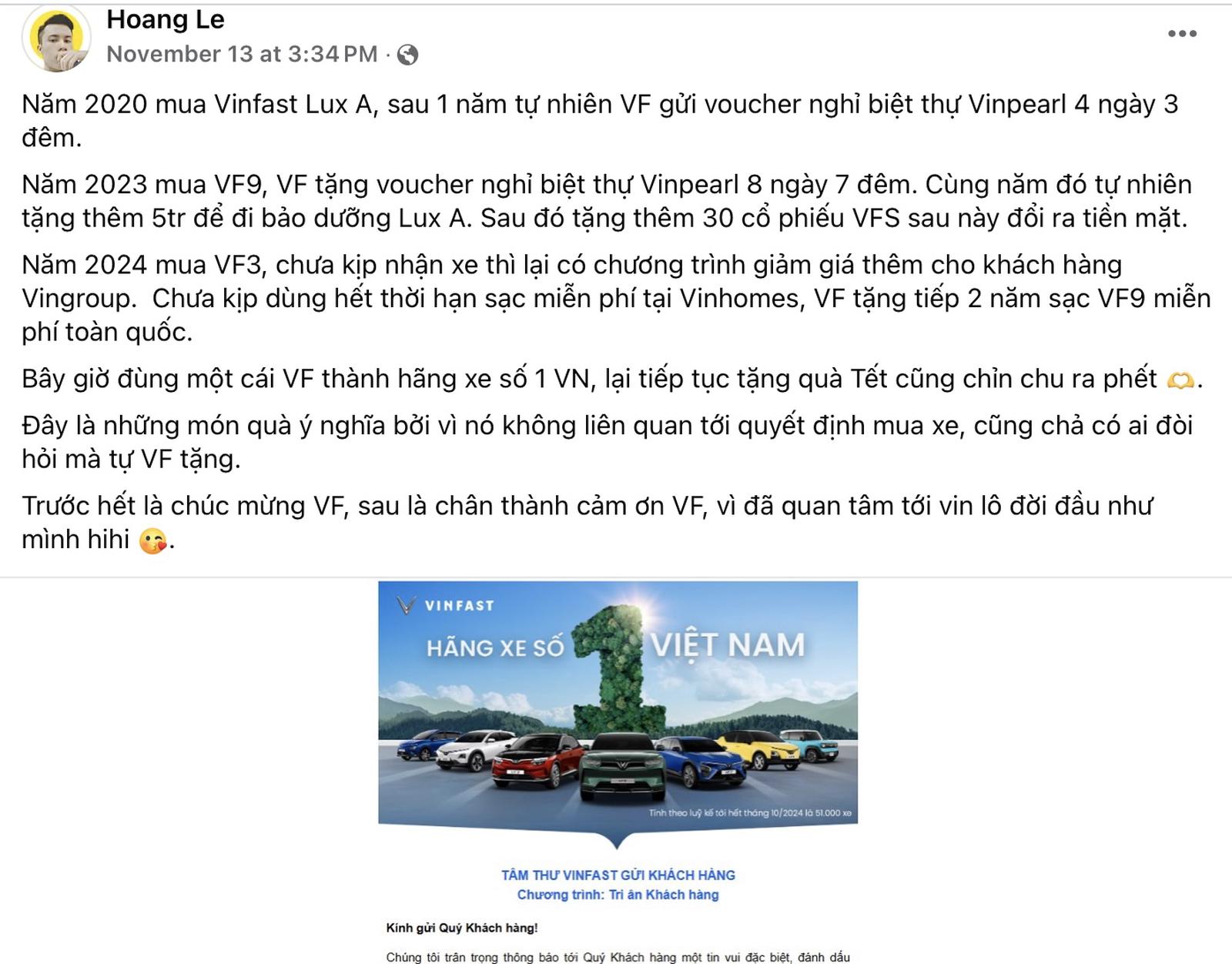 Trên thực tế, đây cũng không phải lần đầu tiên hãng xe của tỷ phú số 1 Việt Nam tri ân khách hàng bằng những món quà đầy ý nghĩa như vậy. Theo người dùng Hoang Le, để cảm ơn những chủ xe tiên phong đồng hành, ngay từ thời điểm bắt đầu kinh doanh, VinFast đã liên tục tặng quà cho cả khách hàng mới và khách hàng hiện hữu như: voucher nghỉ dưỡng, voucher dịch vụ bảo dưỡng, chính sách sạc miễn phí… Song song đó, hãng đã đưa ra hàng loạt chương trình ưu đãi “khủng”, tạo điều kiện cho các chủ xe xăng dễ dàng đổi sang xe điện.
