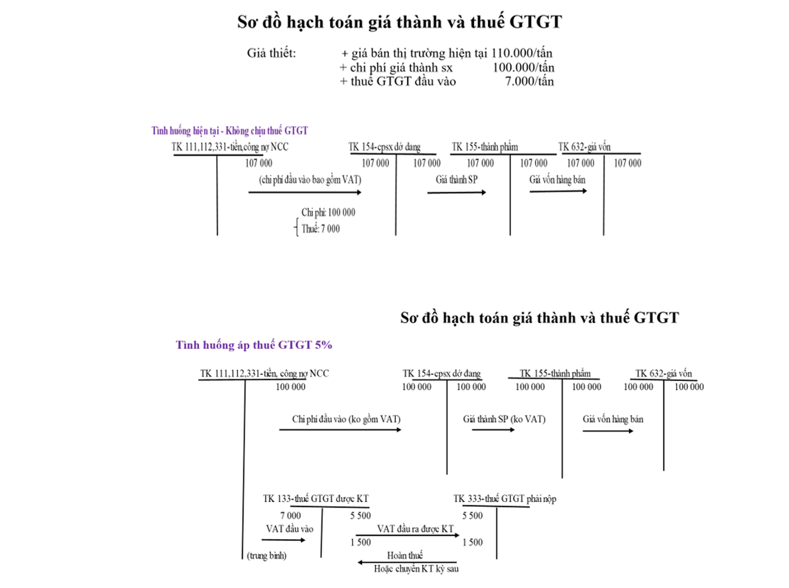 Giả thiết hạch toán cụ thể của chuyên gia Nguyễn Đình Cư như sau: Giá vốn hàng bán, chi phí giá thành sản xuất là 100.000 đồng/tấn phân bón; thuế GTGT đầu vào 7.000 đồng/tấn; doanh nghiệp bán ra thị trường tới tay người nông dân với giá 110.000 đồng/tấn, khấu trừ chi phí và thuế đầu vào, lợi nhuận hiện tại không chịu thuế GTGT đầu ra của doanh nghiệp đạt 3.000 đồng/tấn.