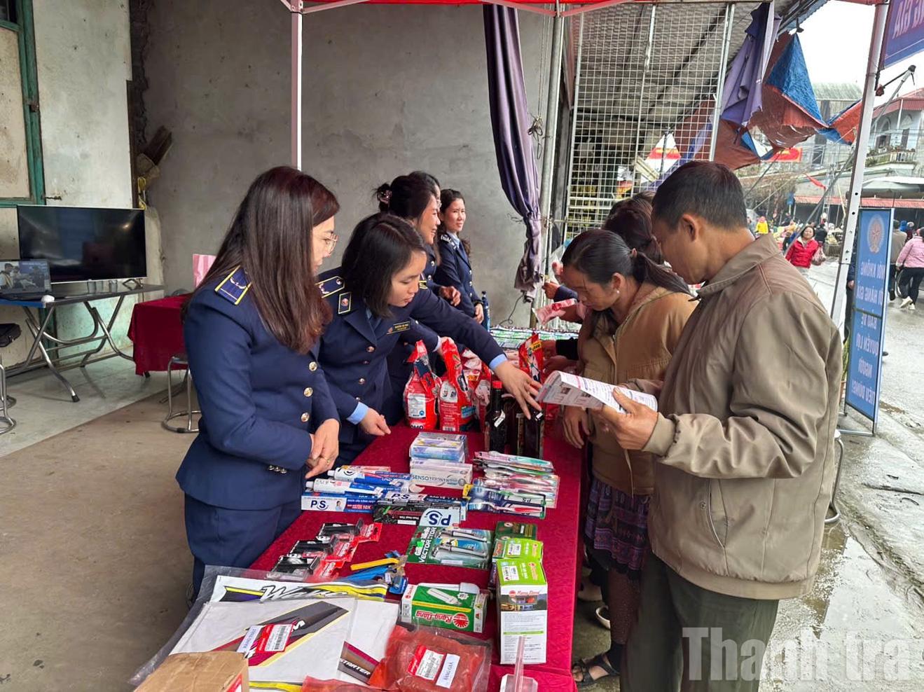 Đội Quản lý thị trường số 3, Chi cục Quản lý thị trường tỉnh Sơn La tổ chức gian hàng trưng bày, giới thiệu, nhận biết và phân biệt hàng thật - hàng để tuyên truyền, hướng dẫn người dân cách nhận biết hàng thật - hàng giả tại Bản Co Chàm, xã Vân Hồ. Ảnh: ND