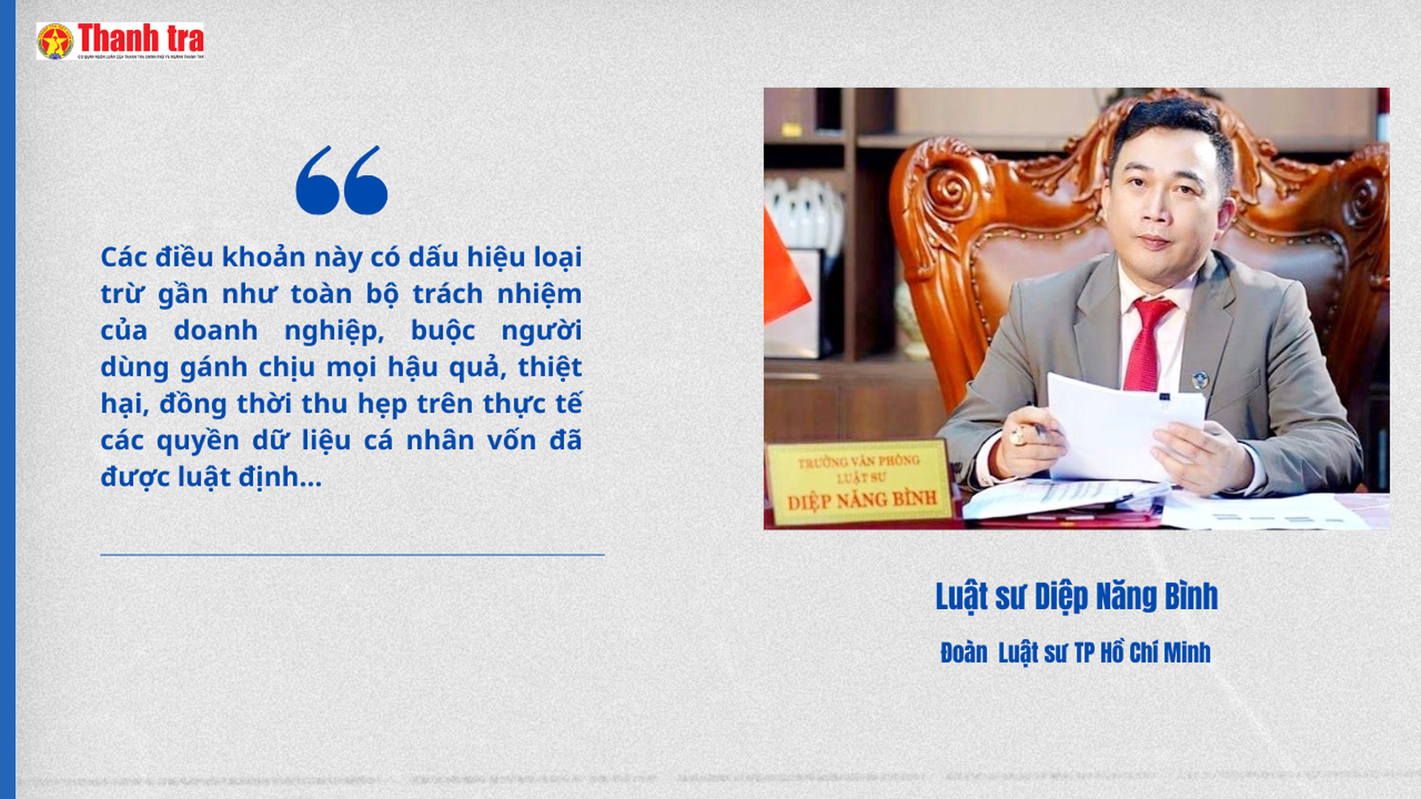 Theo luật sư Diệp Năng Bình, tổng thể Điều 14 không chỉ dừng ở mức tuyên bố miễn trừ thông thường mà ở nhiều nội dung đã vượt quá giới hạn pháp luật cho phép trong quan hệ với người tiêu dùng. Các điều khoản này có dấu hiệu loại trừ gần như toàn bộ trách nhiệm của doanh nghiệp, buộc người dùng gánh chịu mọi hậu quả, thiệt hại, đồng thời thu hẹp trên thực tế các quyền dữ liệu cá nhân vốn đã được luật định.