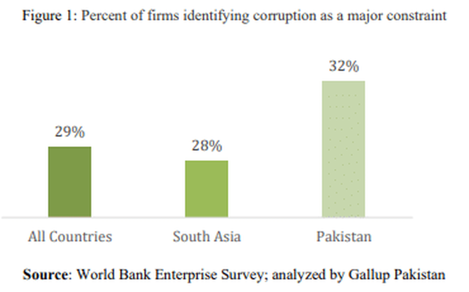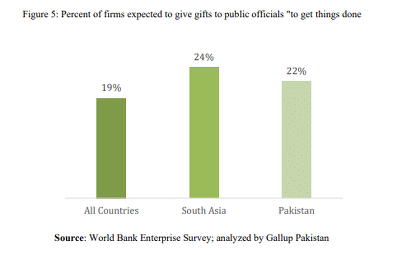 Trong báo cáo “Tham nhũng - Khảo sát doanh nghiệp của Ngân hàng Thế giới năm 2022”, Tổ chức Nghiên cứu Gallup Pakistan cho biết, những trở ngại như tham nhũng ở Pakistan cao so với các khu vực khác trên thế giới, có thể làm giảm cơ hội cho những người mới tham gia thị trường và tăng chi phí hoạt động chung.
