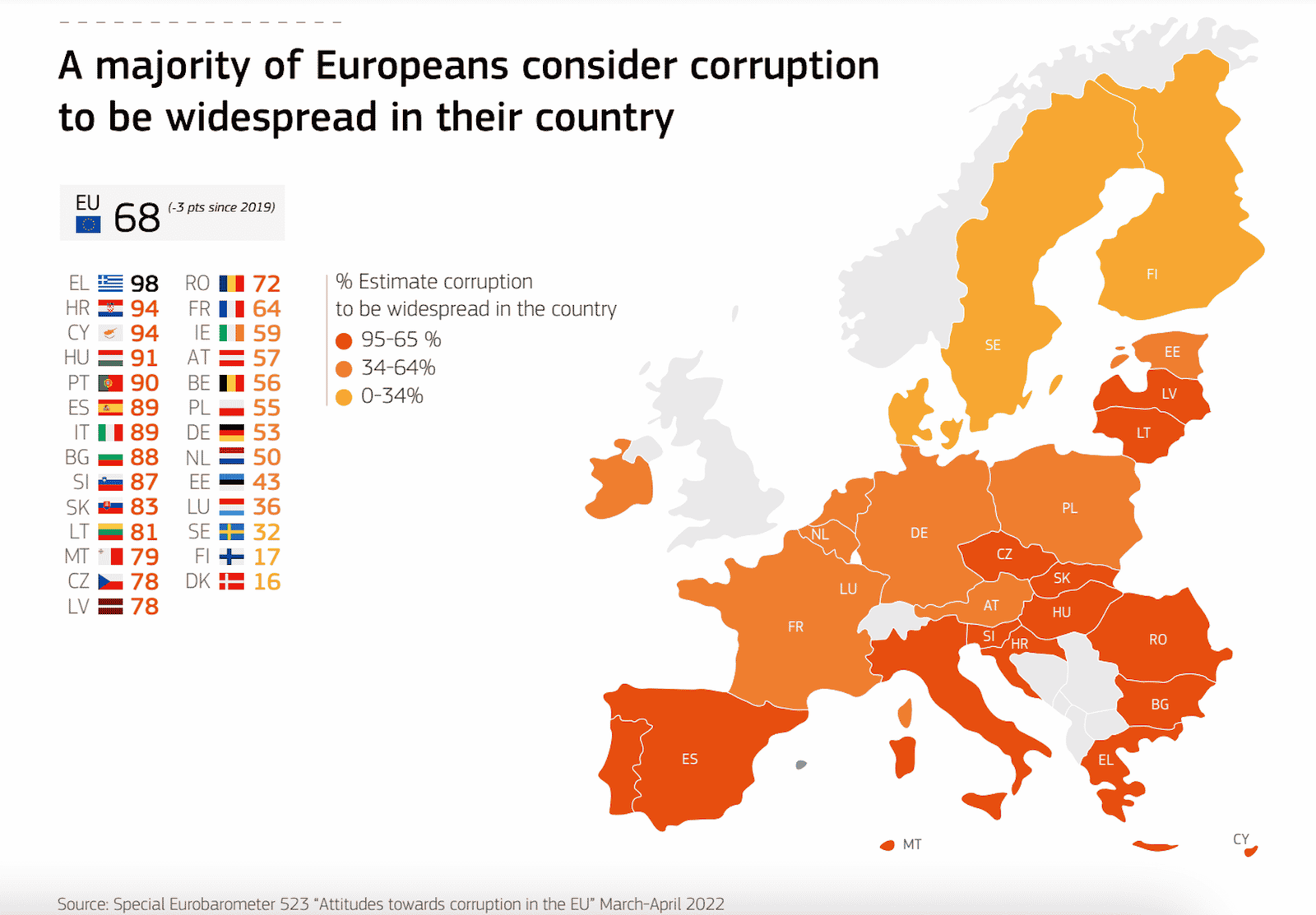 Tại Hy Lạp, 92% số người được hỏi tin rằng có tham nhũng trong các cơ quan địa phương hoặc khu vực. Trong khi con số trung bình của tất cả các nước thành viên EU là 72%.