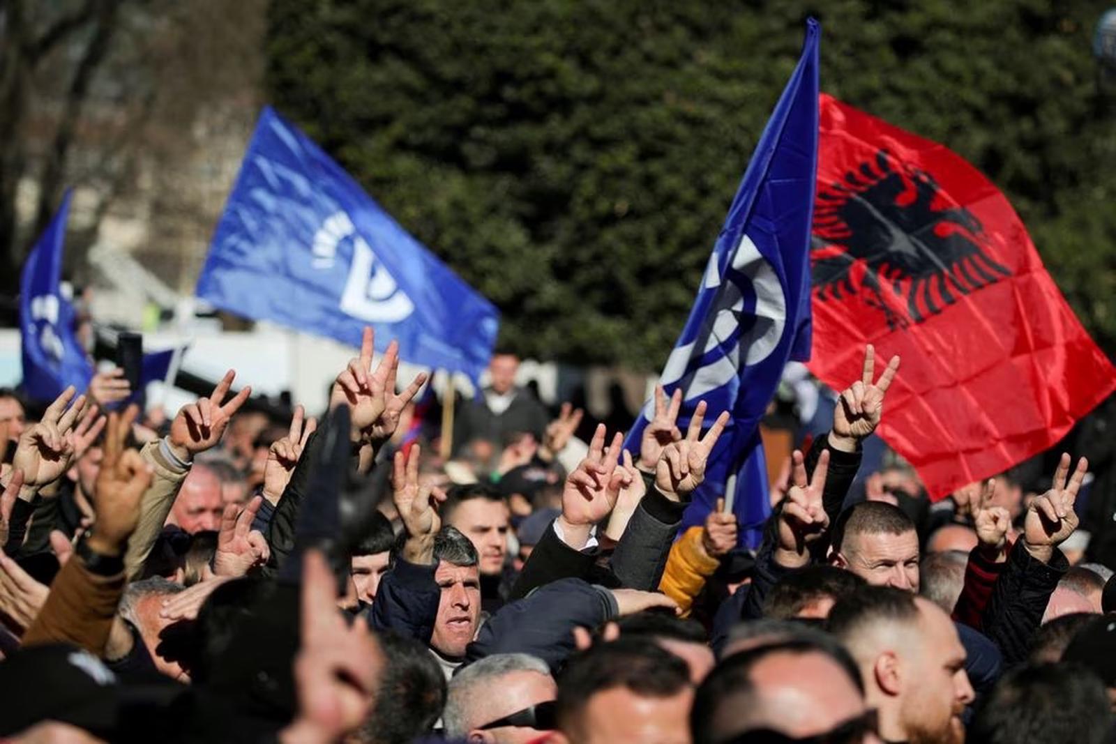 Người dân tham gia cuộc biểu tình chống Chính phủ do lãnh đạo Đảng Dân chủ đối lập dẫn đầu, ở Tirana, Albania, ngày 11/2/2023. Ảnh: REUTERS/Florion Goga