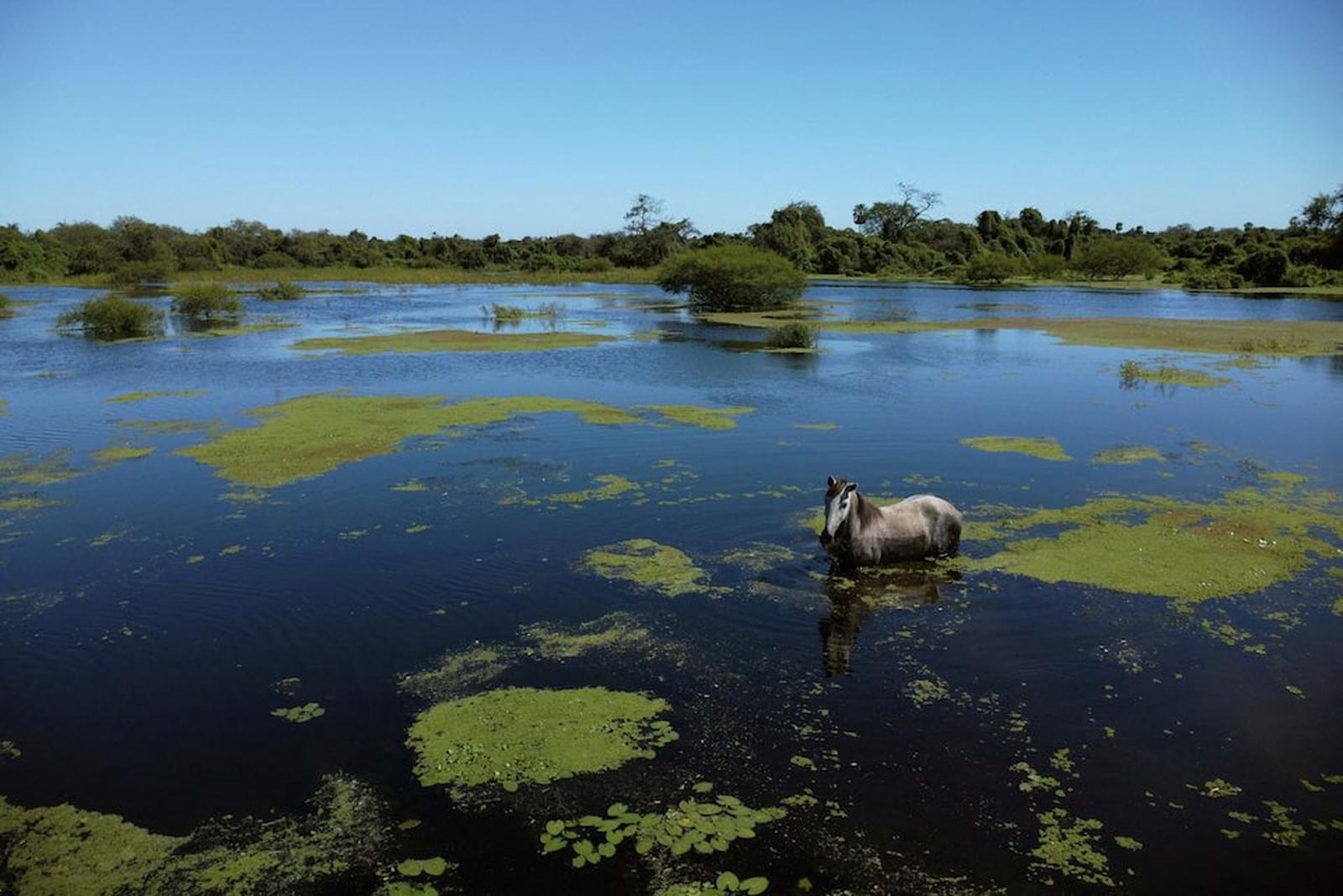 Một con ngựa đang bơi tại Banado La Estrella, ở Formosa, Argentina ngày 20/4/2023. Ảnh: REUTERS/Agustin Marcarian