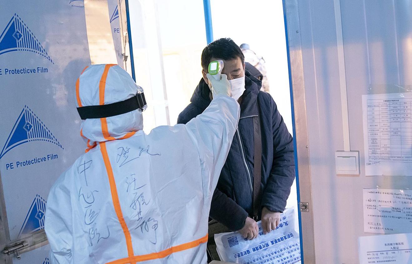 Nhân viên y tế kiểm tra thân nhiệt cho bệnh nhân nhiễm nCoV tại một bệnh viện dã chiến ở Vũ Hán, Trung Quốc. (Ảnh: THX/TTXVN)