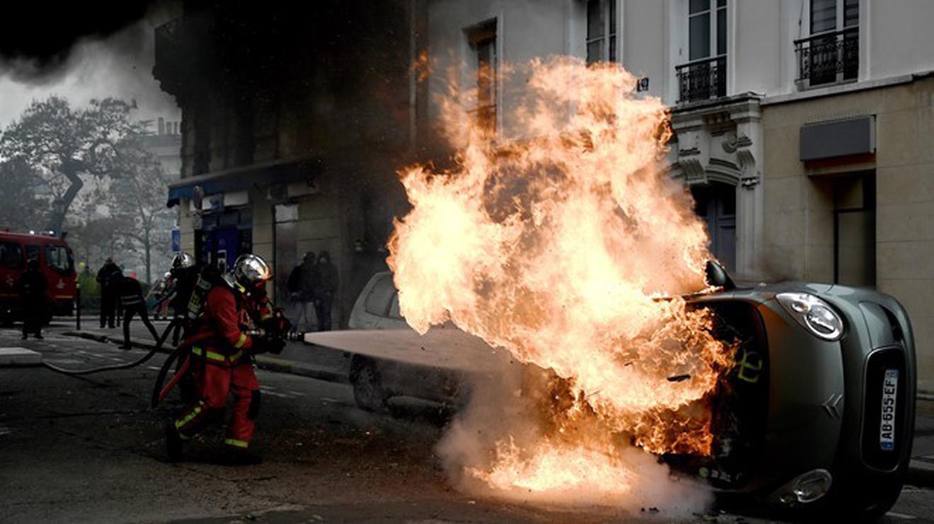Lính cứu hỏa phun nước vào một chiếc xe bị người biểu tình đốt ở Paris ngày 16/11. (Ảnh: AFP)