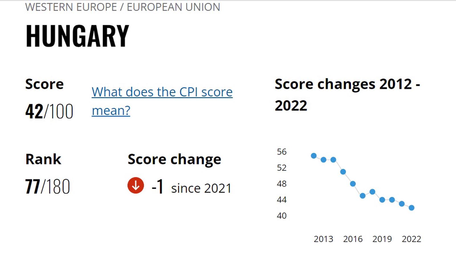 Hungary được đánh giá là tham nhũng nhất EU. Theo chỉ số cảm nhận tham nhũng (CPI) do TI công bố hàng năm, Hungary thuộc nhóm có sự sụt giảm điểm CPI mạnh nhất khu vực, với 42 điểm trong năm 2022, giảm tới 9 điểm kể từ năm 2015, đứng ở cuối bảng xếp hạng khu vực.