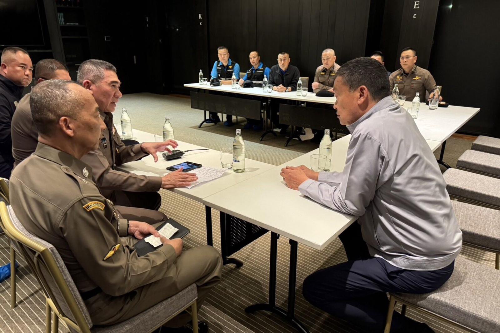 Thủ tướng Srettha Thavisin họp bàn với các quan chức cảnh sát và lực lượng chức năng Thái Lan ngay tại khách sạn tối 16/7. Ảnh: Matichon