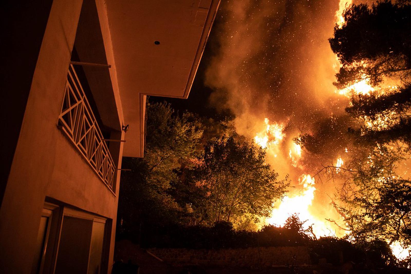 Một đám cháy rừng thiêu rụi khu vực xung quanh và sân sau của những ngôi nhà ở phía Bắc Athens, Hy Lạp, ngày 7/8/2021. Ảnh: Lefteris Partsalis / Xinhua