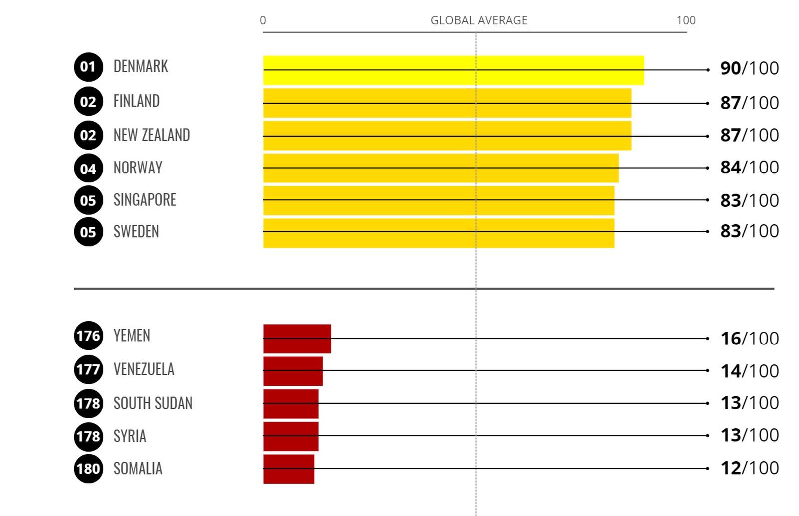 Ở phía ngược lại, các quốc gia đang trải qua xung đột hoặc nơi các quyền tự do cá nhân và chính trị cơ bản bị hạn chế có xu hướng bị điểm thấp nhất. Năm nay, Somalia (12), Syria (13) và Nam Sudan (13) đứng cuối bảng xếp hạng. Venezuela (14), Yemen (16), Libya (17), Haiti (17), Guinea Xích Đạo (17) và Burundi (17) cũng nằm trong nhóm 10 nước tham nhũng nhất.