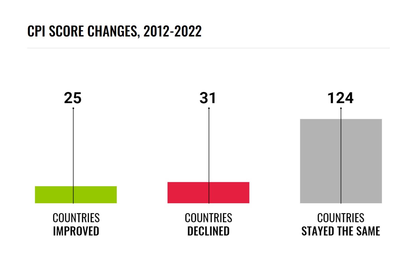 Theo TI, nhìn chung, CPI cho thấy mức độ tham nhũng đã không cải thiện hoặc trở nên tồi tệ hơn ở 86% quốc gia trong thập kỷ qua.