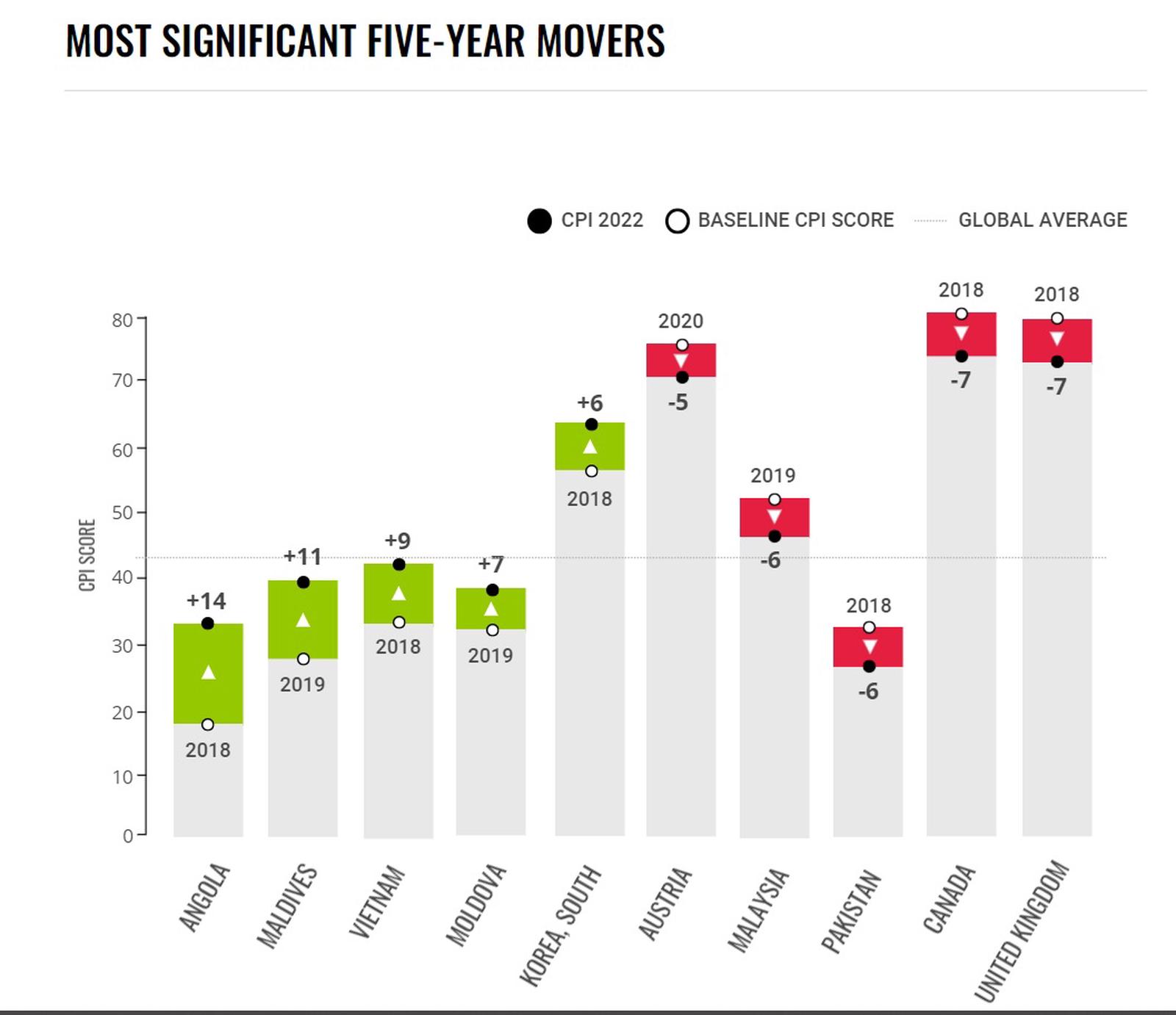 Năm 2022, Việt Nam tăng 3 điểm CPI so với năm 2021, từ 39 lên 42. Trong đánh giá CPI 5 năm gần đây (ảnh trên), cùng với Angola, Maldives, Moldova và Hàn Quốc, Việt Nam là 1 trong 5 nước trên thế giới có những cải thiện tích cực mạnh mẽ nhất, với mức tăng 9 điểm kể từ năm 2018. Tại bảng xếp hạng CPI 180 quốc gia, vùng lãnh thổ, Việt Nam đã tiến 10 bậc, từ xếp thứ 87 (năm 2021) lên 77 (năm 2022), cho thấy những nỗ lực, sự quyết tâm mạnh mẽ chống tham nhũng trong nước năm qua đã được ghi nhận.