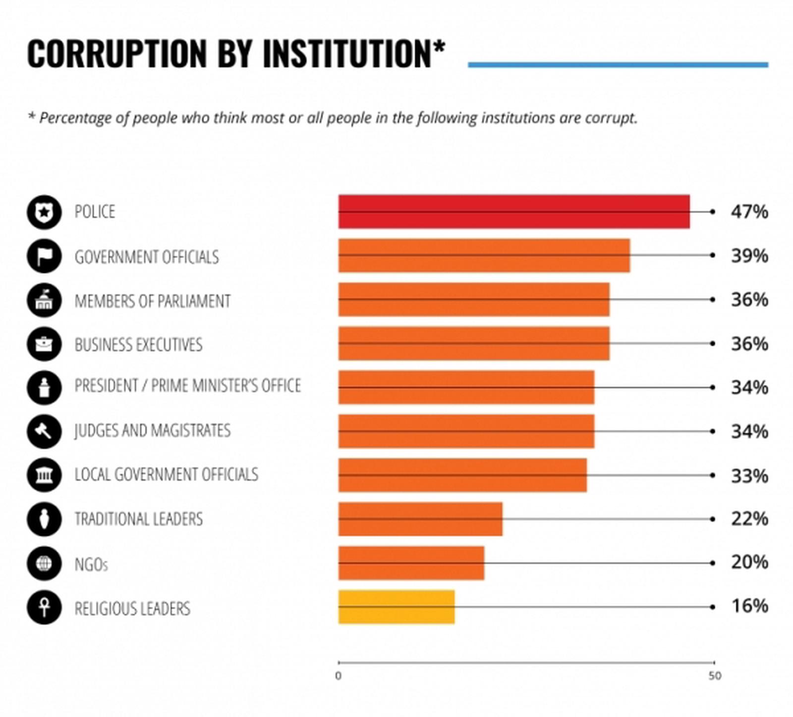 Người dân cho rằng, cảnh sát là tổ chức tham nhũng nhất, với 47% người dân tin rằng, hầu hết hoặc tất cả cảnh sát đều tham nhũng. Những kết quả này phù hợp với các phát hiện từ báo cáo năm 2015.