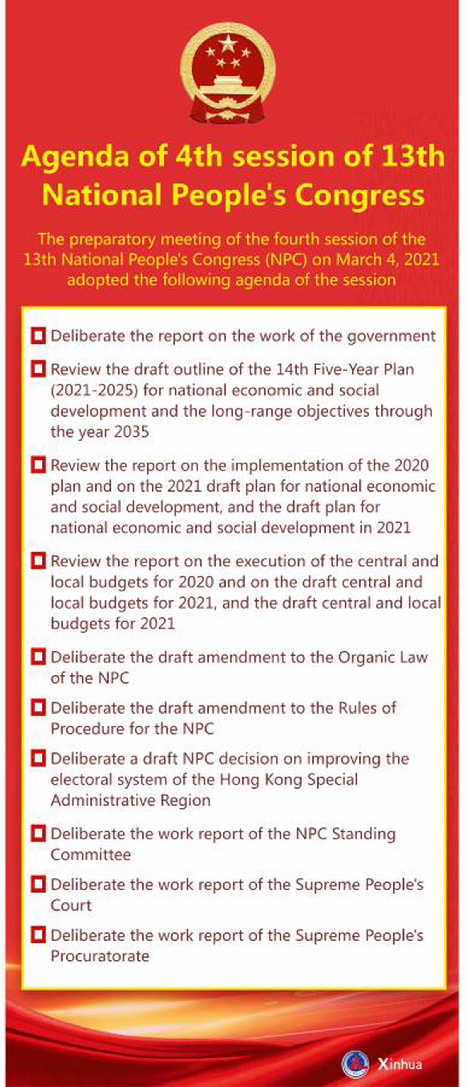 Theo nghị trình, 10 nội dung được đưa ra thảo luận tại kỳ họp. Bên cạnh các nghị trình theo thông lệ, như dự thảo Báo cáo công tác Chính phủ, dự thảo Chương trình phát triển kinh tế xã hội năm 2021... việc xem xét thông qua dự thảo Đề cương Quy hoạch 5 năm lần thứ 14 (giai đoạn 2021-2025) và Mục tiêu tầm nhìn đến năm 2035, Dự thảo Quyết định về việc hoàn thiện chế độ bầu cử Khu hành chính đặc biệt Hong Kong của Quốc hội Trung Quốc... cũng là những vấn đề quan trọng được quan tâm.