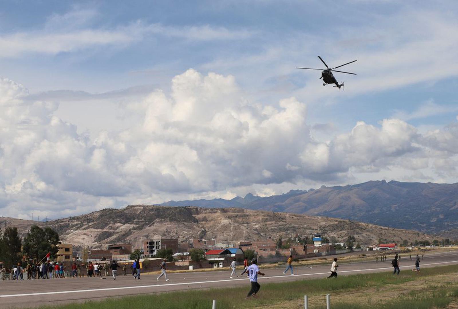 Một chiếc trực thăng bay qua những người biểu tình trên đường băng sân bay ngày 15/12/2022. Ảnh: REUTERS/Miguel Gutierrez Chero