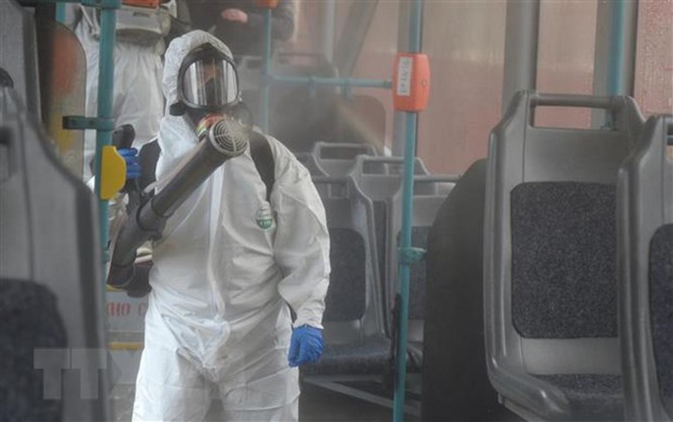 Khử trùng nhằm ngăn ngừa dịch COVID-19 trên xe điện ở Saint Petersburg, Nga. (Ảnh: AFP/TTXVN)