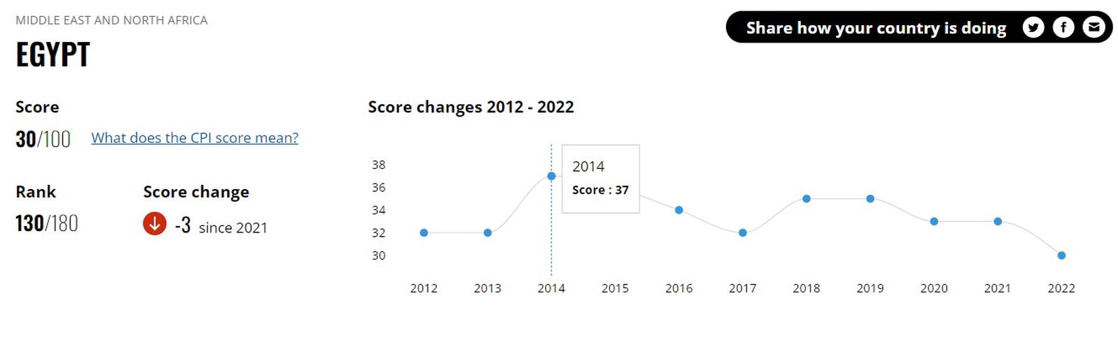 Năm 2022, điểm CPI của Ai Cập giảm chỉ còn 30 - mức điểm thấp kỷ lục kể từ năm 2012.