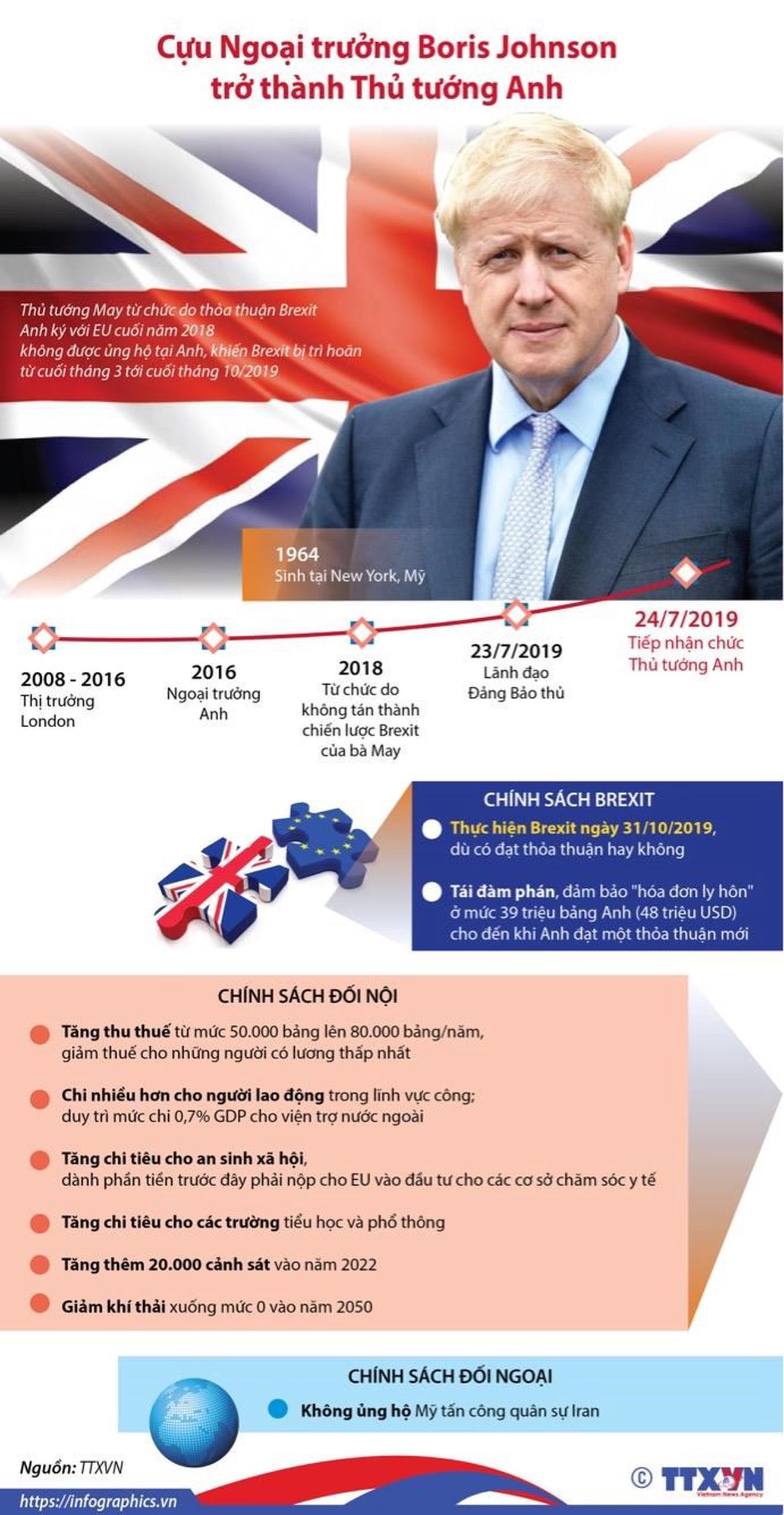 Cựu Ngoại trưởng Anh Boris Johnson ngày 23/7 đã được bầu làm lãnh đạo đảng Bảo thủ và trở thành Thủ tướng tiếp theo của Vương quốc Anh, thay thế Thủ tướng Theresa May vào ngày 24/7.