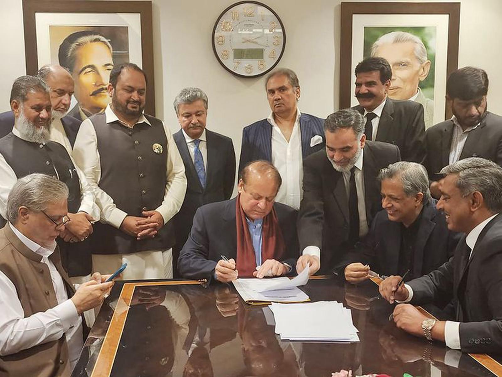 Bức ảnh được chụp và phát hành vào ngày 21/10/2023, bởi Đảng Liên đoàn Hồi giáo Pakistan-Nawaz (PMLN) cho thấy cựu Thủ tướng Pakistan Nawaz Sharif (giữa ảnh) đang ký một văn bản pháp lý sau khi ông đến Sân bay Islamabad.