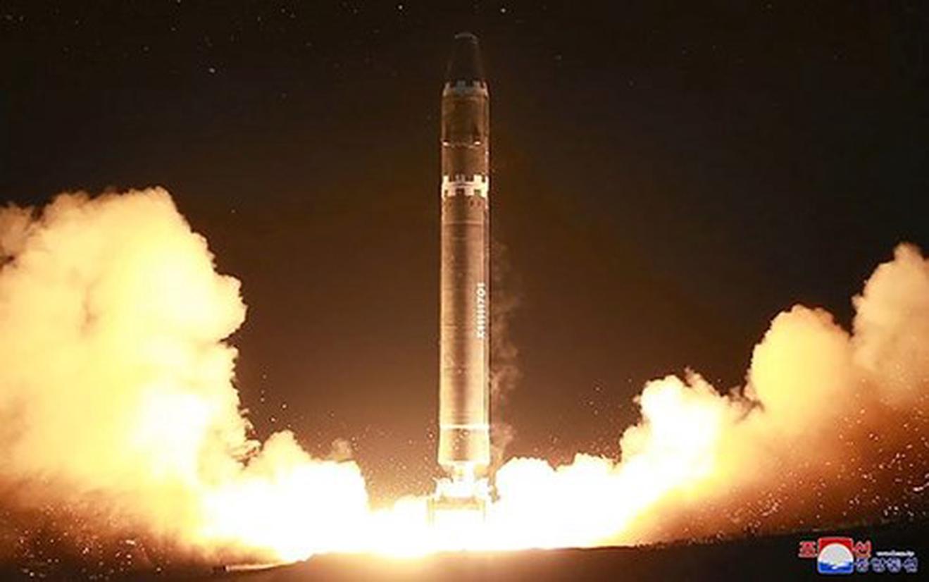 Tên lửa Hwasong-15 của Triều Tiên rời bệ phóng. Ảnh: AP