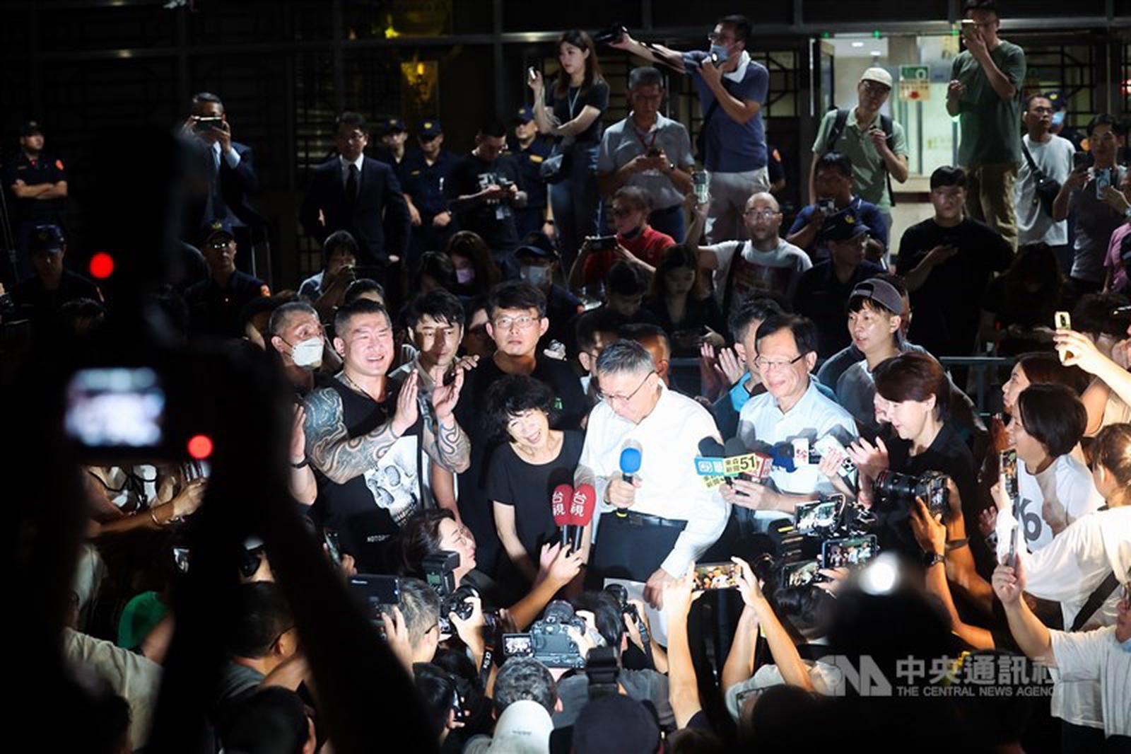 Chủ tịch Đảng Dân chúng Đài Loan Kha Văn Triết (áo sơ mi trắng) phát biểu trước những người ủng hộ sau khi ông được tại ngoại vào ngày 2/9/2024. Ảnh: CNA