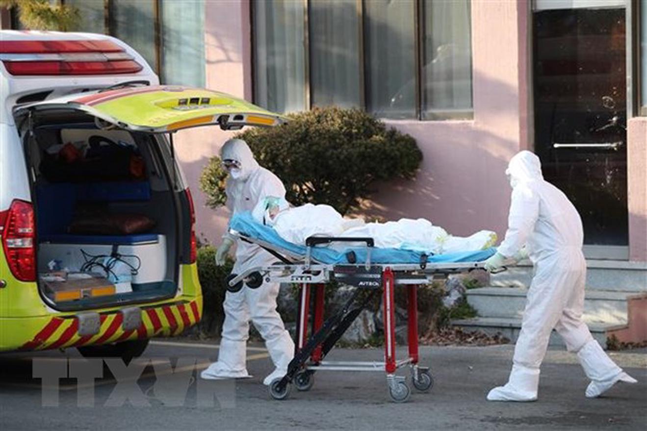 Nhân viên y tế chuyển bệnh nhân nhiễm COVID-19 lên xe cứu thương tại thành phố Daegu, Hàn Quốc ngày 21/2/2020. (Ảnh: AFP/TTXVN)