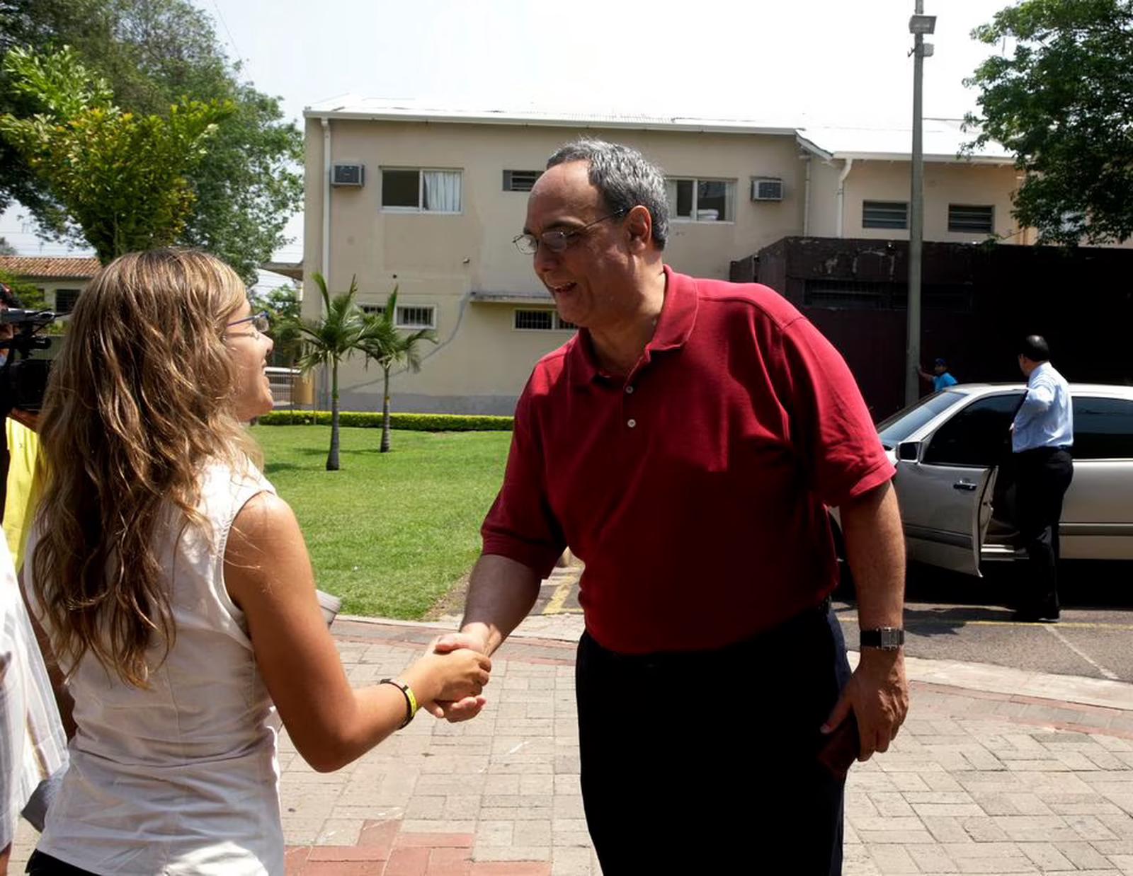 Manuel Burga Seoane, Chủ tịch Liên đoàn Bóng đá Peru (phải ảnh) tại sân vận động của câu lạc bộ Libertad trước buổi tập ở Asuncion, ngày 13/10/2008. Ảnh: REUTERS/Jorge Adorno