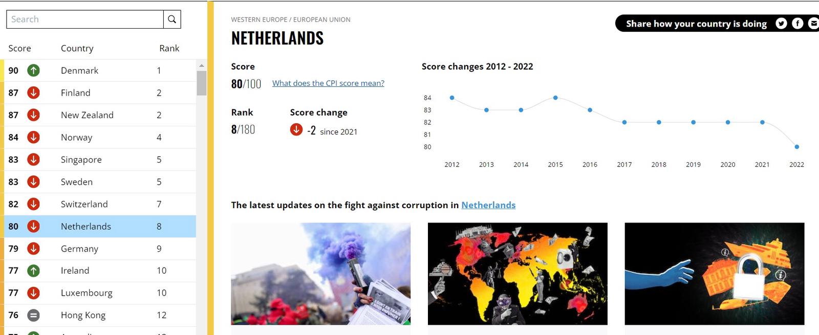 Năm 2022, Hà Lan được Tổ chức Minh bạch Quốc tế xếp hạng trong sạch thứ 8 trong 180 quốc gia được khảo sát về tham nhũng. Nguồn: TI