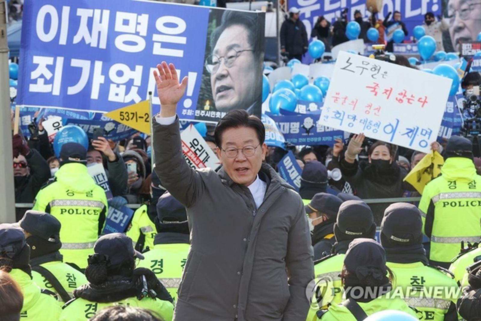 Những người ủng hộ ông Lee Jae-myung, lãnh đạo Đảng Dân chủ đối lập chính, giương cao biểu ngữ ghi "Lee Jae-myung vô tội" khi ông vẫy tay chào họ trước khi bước vào Văn phòng Công tố quận Trung tâm Seoul vào ngày 28/1/2023, để thẩm vấn liên quan đến một dự án phát triển bất động sản đầy tham nhũng ở thành phố Seongnam, phía Nam Seoul, được đưa ra khi ông Lee còn là Thị trưởng. Ảnh: Yonhap