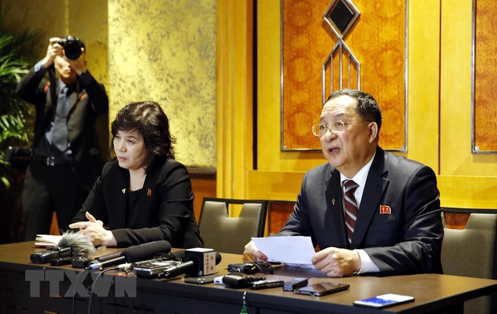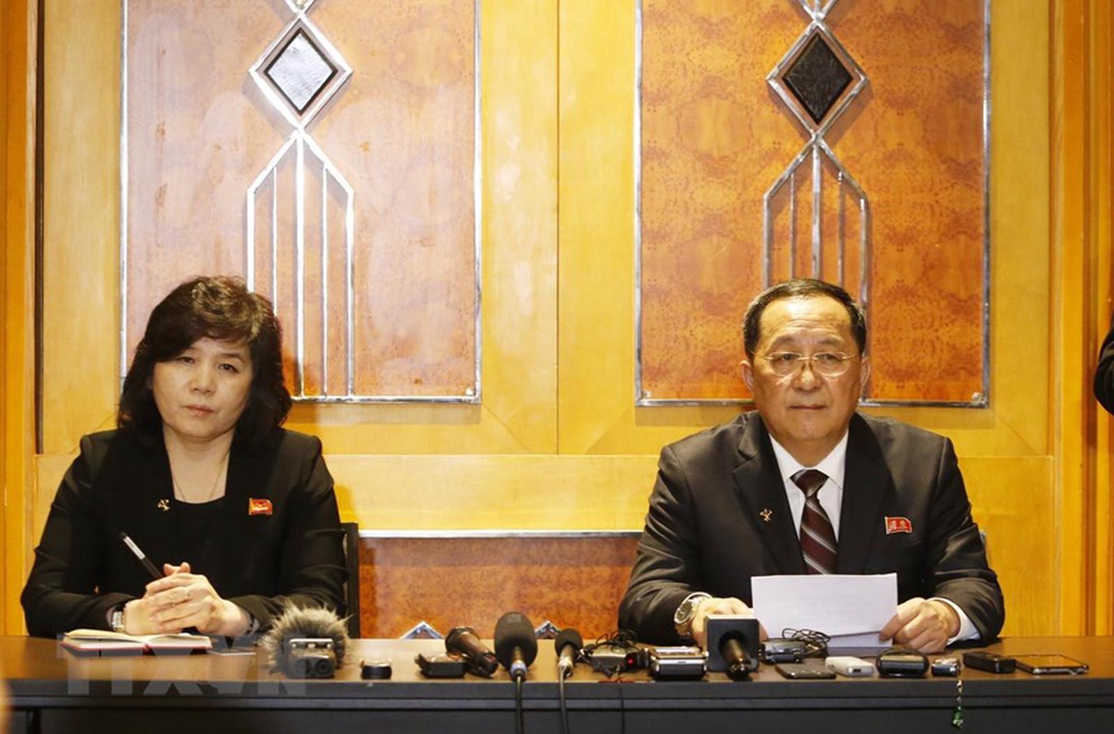 Bộ trưởng Bộ Ngoại giao Triều Tiên Ri Yong-ho (phải) chủ trì họp báo về Hội nghị Thượng đỉnh Mỹ-Triều Tiên lần thứ hai. (Ảnh: Lâm Khánh/TTXVN)