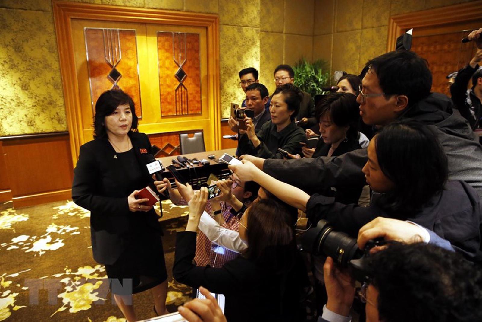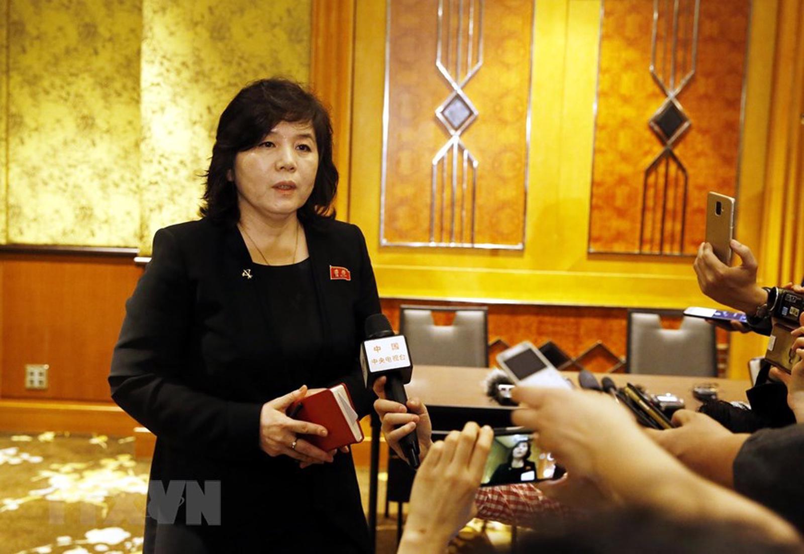 Thứ trưởng Bộ Ngoại giao Triều Tiên Choe Son Hui trả lời các phóng viên báo chí sau họp báo. (Ảnh: Lâm Khánh/TTXVN)