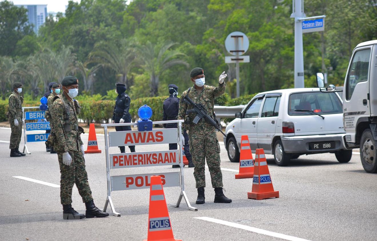 Binh sỹ Malaysia làm nhiệm vụ tại một chốt chặn trong thời gian thực thi lệnh phong tỏa nhằm ngăn dịch COVID-19 lây lan, ở Putrajaya ngày 22/3/2020. (Nguồn: THX/TTXVN)