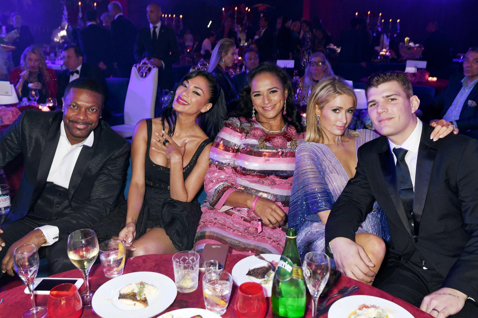 Isabel dos Santos (giữa ảnh) tại một bữa tiệc xa xỉ năm 2018 với chai rượu vang Chateau Mouton 310.700 USD. Các khách mời nổi tiếng bao gồm, từ trái sang: Chris Tucker, Nicole Scherzinger, Paris Hilton và Chris Zylka. Ảnh: David M. Benett/ Getty Images