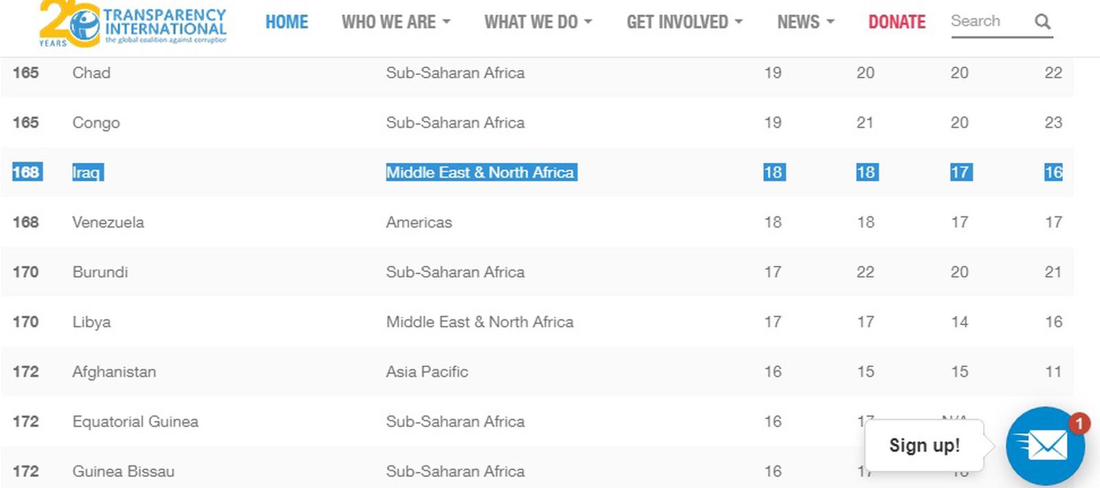 Năm 2018, Chỉ số nhận thức tham nhũng của Iraq đạt 18 điểm, xếp thứ 168/180 quốc gia.
