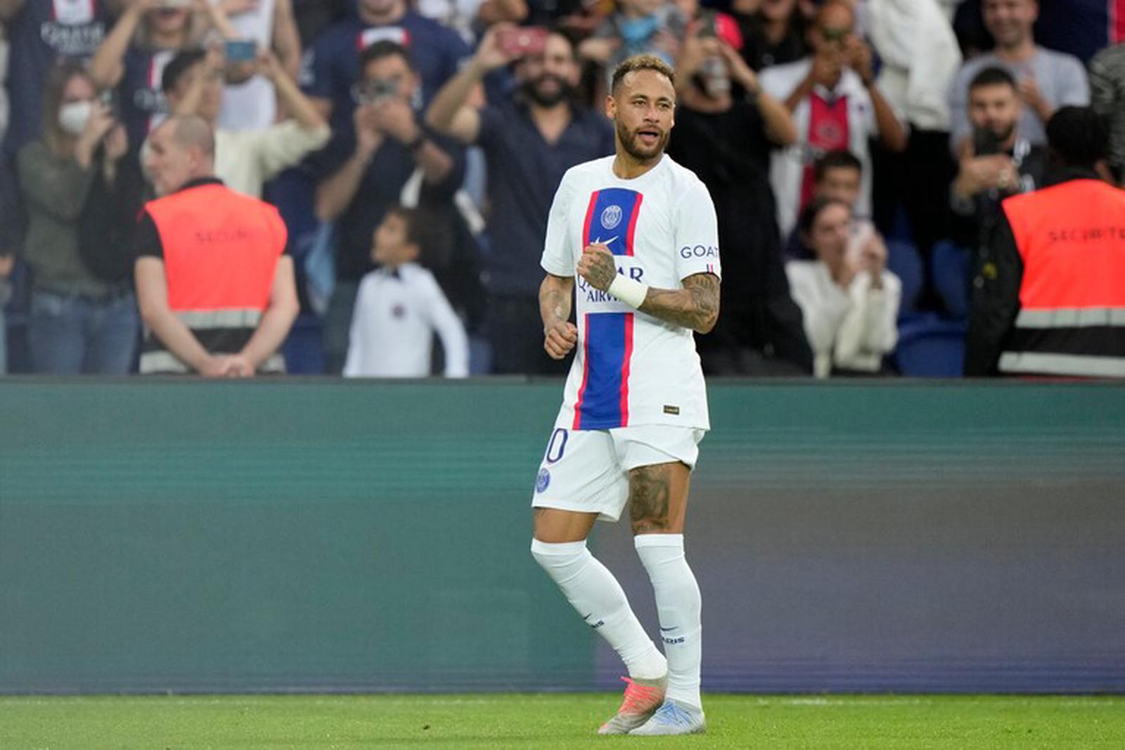 Neymar trong màu áo Paris Saint-Germain ăn mừng sau khi ghi bàn thắng thứ ba cho đội bóng, trong trận đấu với Troyes tại sân vận động Parc des Princes (Paris, Pháp), ngày 29/1/2022. Ảnh: AP / Francois Mori