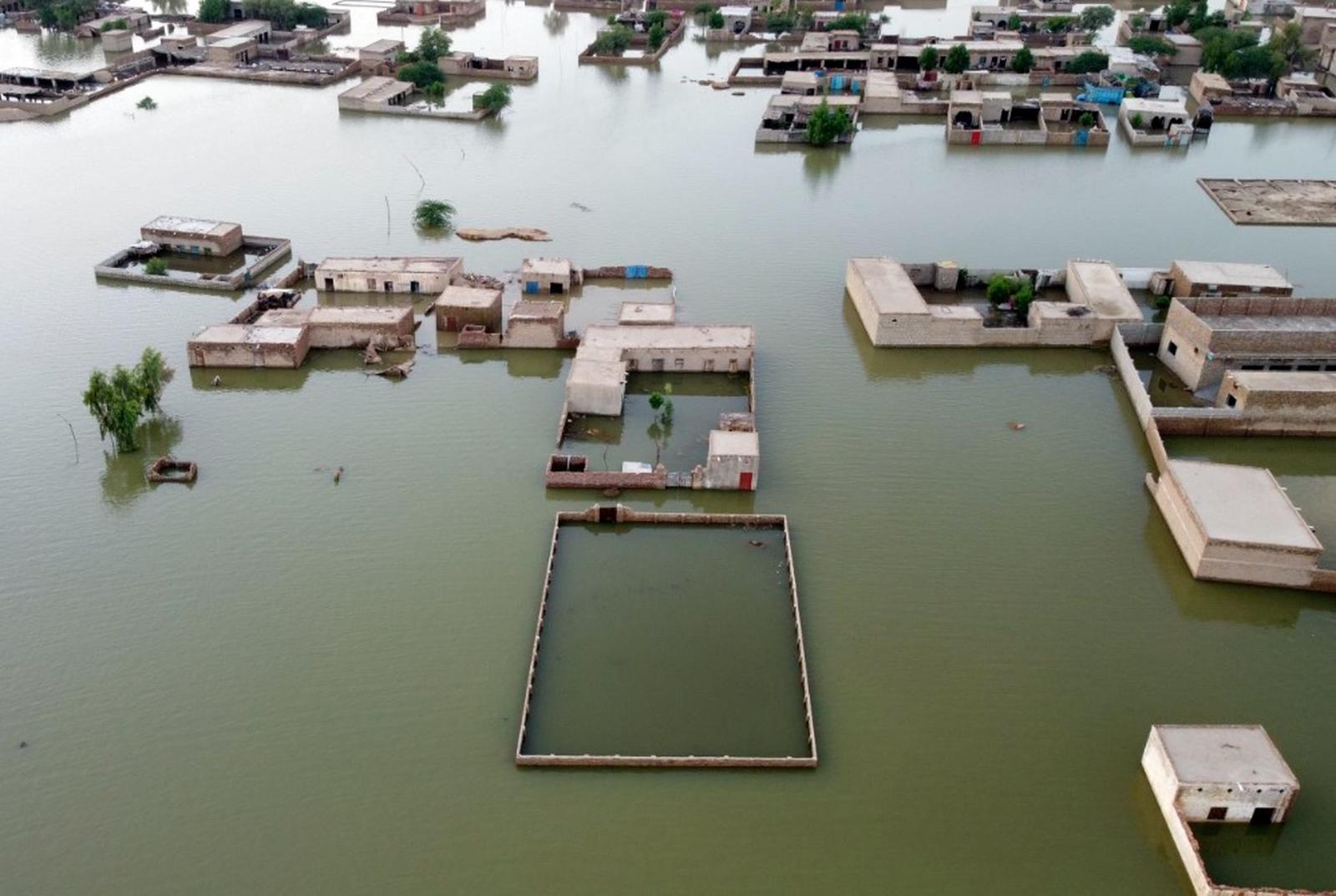 Những ngôi nhà bị bao vây bởi nước lũ ở Jaffarabad, Pakistan, ngày 1/9/2022. Ảnh: Zahid Hussain/AP