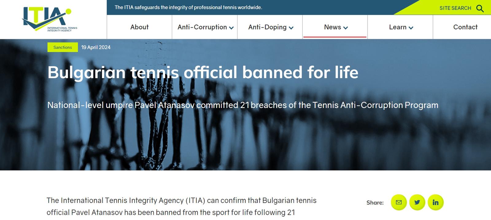 Vụ việc gần đây nhất, trọng tài người Bulgaria Pavel Atanasov đã bị cấm tham gia các trận đấu quần vợt suốt đời sau khi rút đơn kháng cáo đối với các vi phạm liên quan đến cá cược và cáo buộc tham nhũng.
