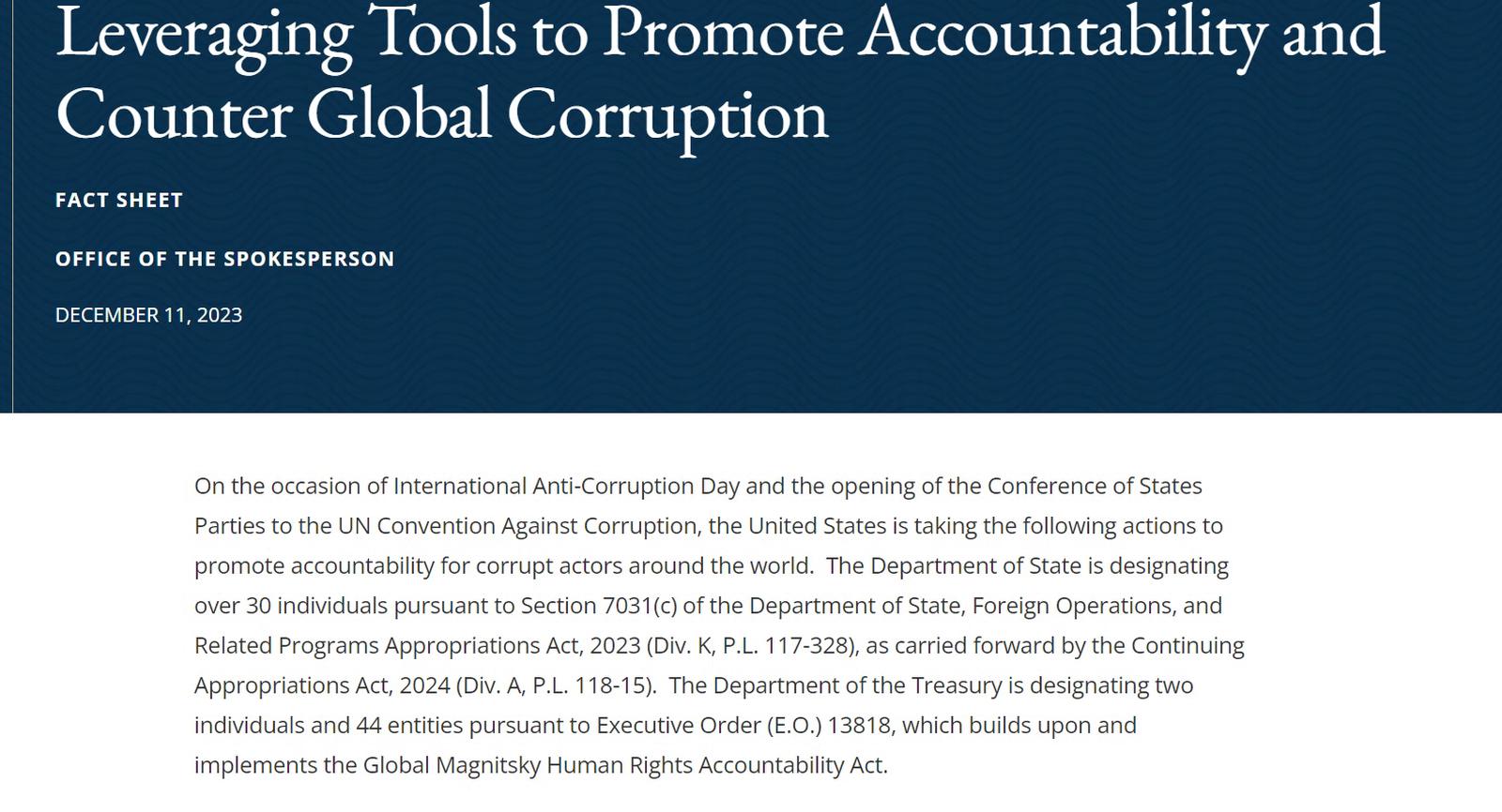 Cũng trong ngày 11/12, một tuyên bố của Bộ Ngoại giao Mỹ cho biết, nhân Ngày Quốc tế Chống tham nhũng (9/12) và khai mạc Hội nghị các quốc gia thành viên Công ước Liên hợp quốc về chống tham nhũng lần thứ 10, Mỹ đang thực hiện các hành động để thúc đẩy trách nhiệm giải trình đối với những kẻ tham nhũng trên toàn thế giới.