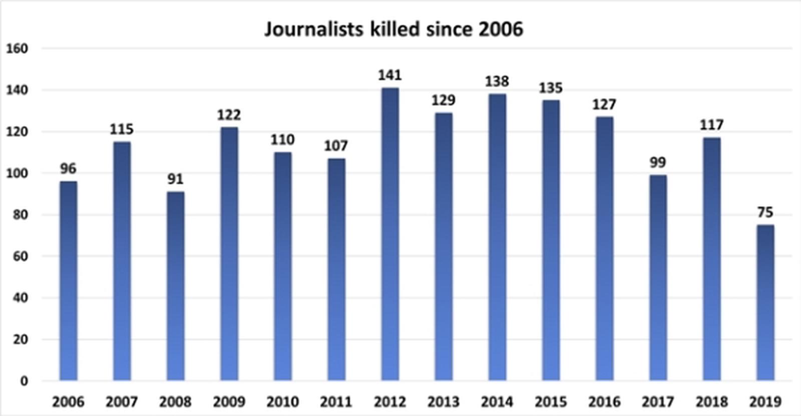 Riêng năm 2019, 75 người làm trong lĩnh vực báo chí truyền thông ở 26 quốc gia đã thiệt mạng, giảm 36% so với năm 2018. Đây là con số thấp nhất kể từ năm 2006.
