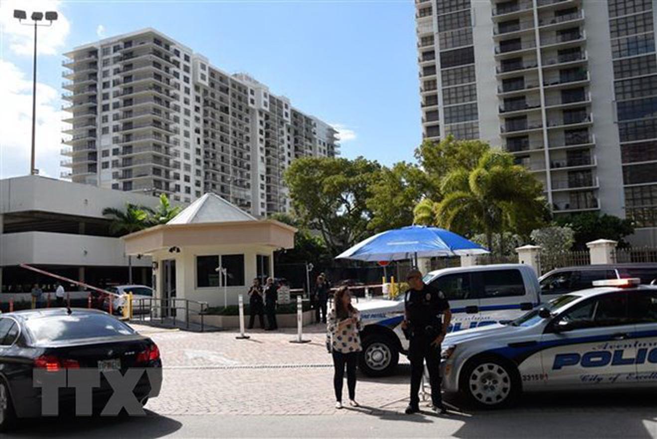 Cảnh sát gác tại tòa nhà nơi mẹ của nghi can Cesar Sayoc sống tại Biscayne Cove, Florida, Mỹ, ngày 26/10. (Nguồn: AFP/TTXVN)