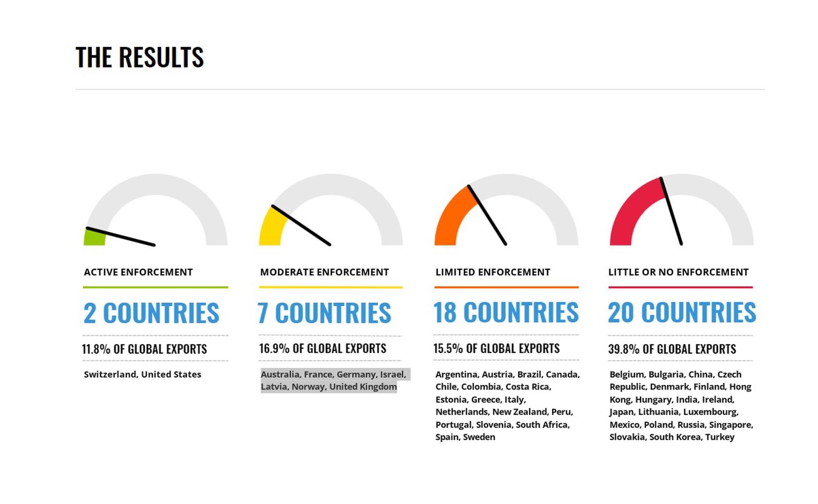 Báo cáo của TI chỉ ra, hiện chỉ có Thụy Sĩ và Mỹ nằm trong danh sách thực thi tích cực. Israel và Vương quốc Anh đã sụt giảm từ mức thực thi tích cực xuống mức trung bình.