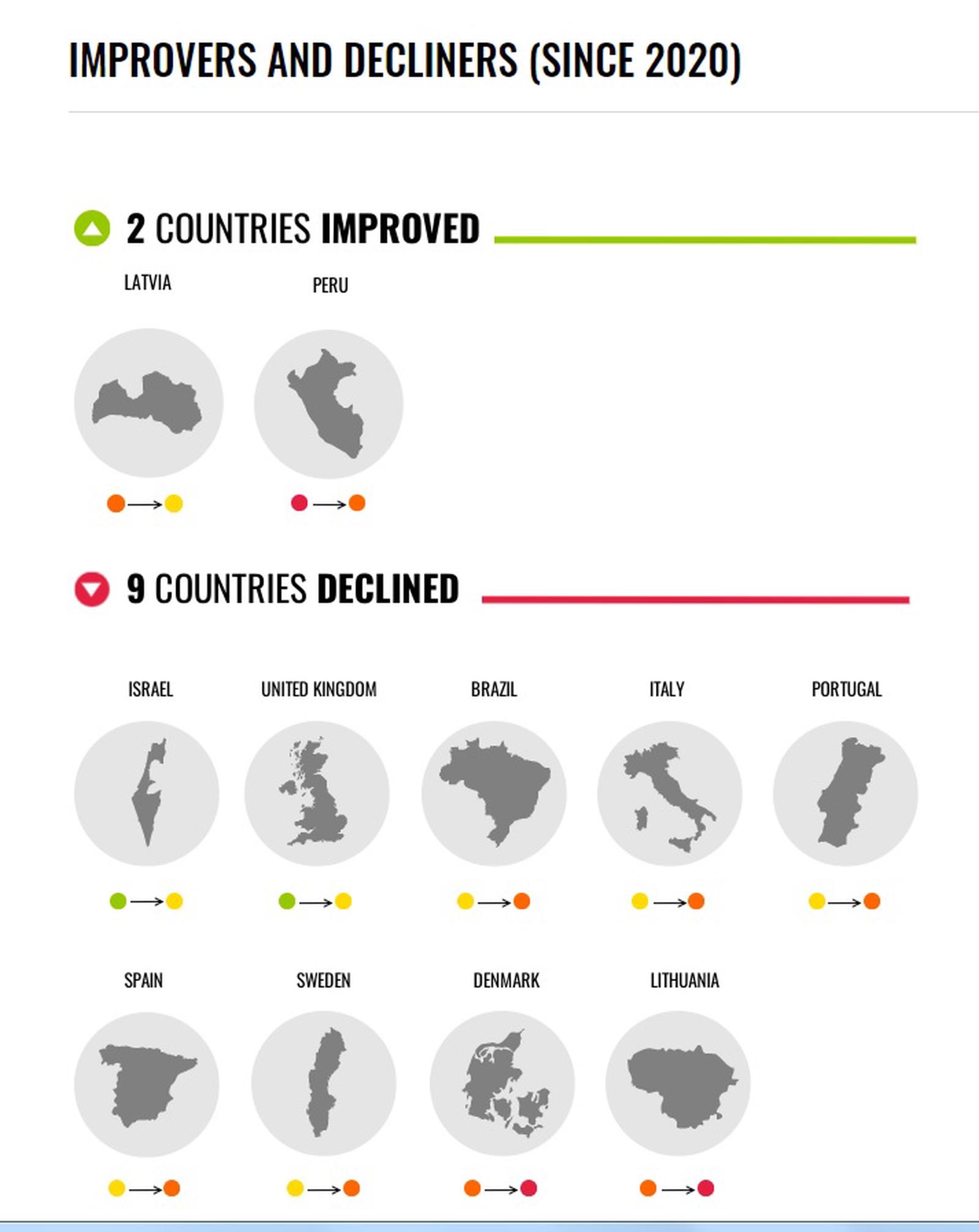Kể từ kỳ đánh giá trước (năm 2020), chỉ có 2 quốc gia là Latvia và Peru tăng một bậc, trong khi 9 quốc gia (bao gồm Đan Mạch và Ý) giảm xuống.