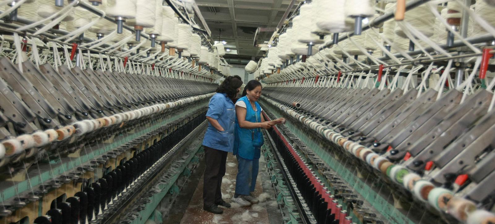 Hai phụ nữ kiểm tra khung dệt công nghiệp trong một nhà máy sản xuất thảm ở Mông Cổ. Ảnh: ILO